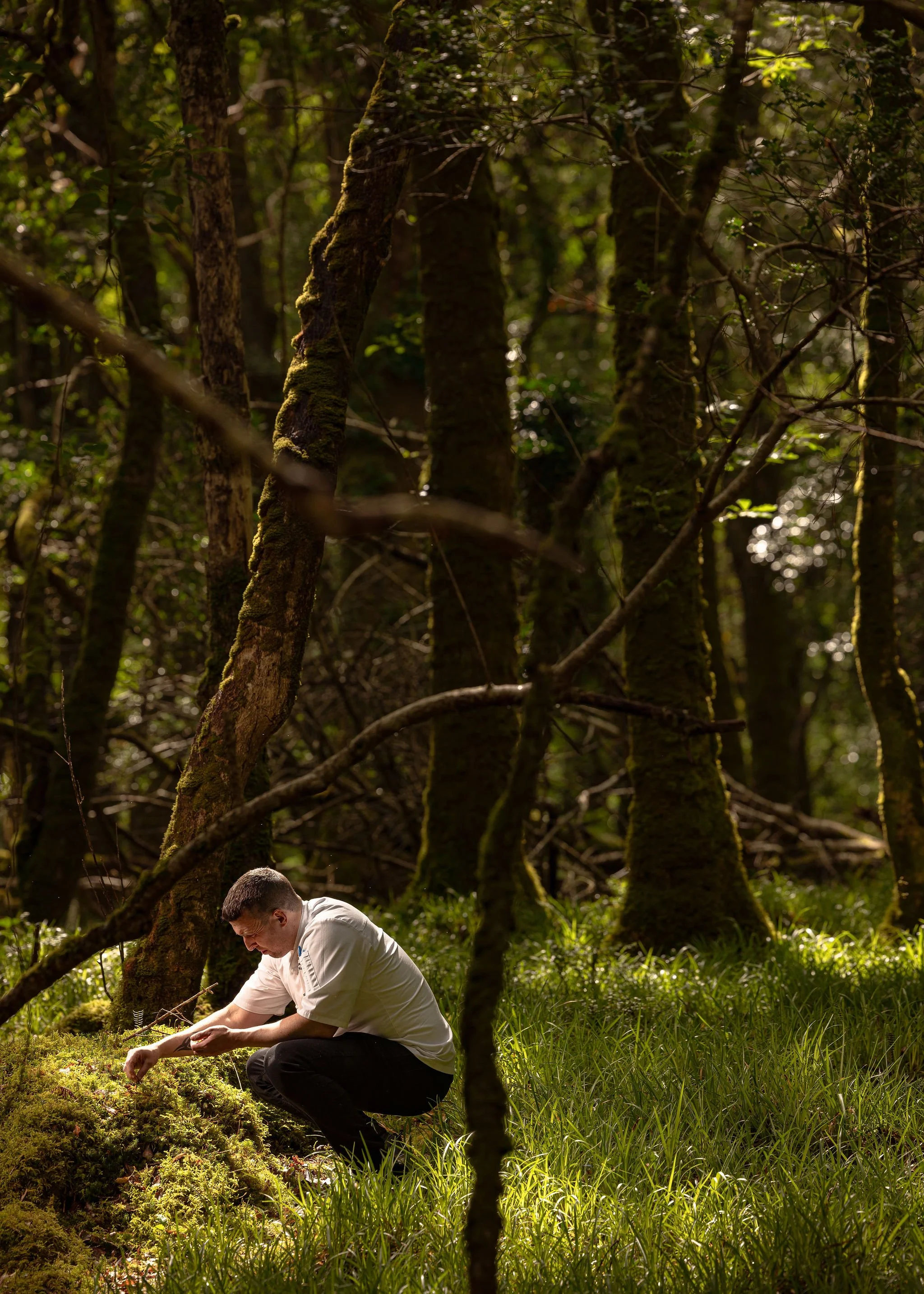 This was a two day shoot. Day one focused on the dishes. Day two followed Mark into the forest and onto the water to meet local producer Portán Fresh Fish in Kenmare, whose sustainably caught lobster and crab feature on the menu. I photographed Mark foraging among the trees and later with the Portán team as they landed their catch, grounding the images in the same provenance that defines his cooking.